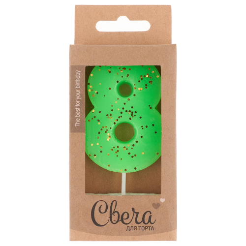 Свеча Цифра, 8 ЭКО, Неон, Зеленый, с блестками, 4*6 + 3 см, 1 шт. с держат., 803228