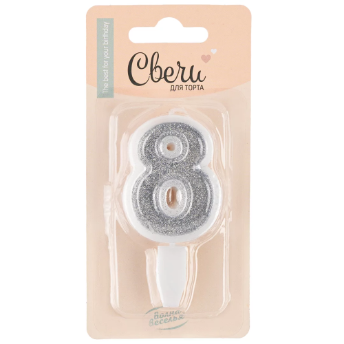 Свеча Цифра, 8, Серебро, с блестками, 5 см, 1 шт. с держат., 130128