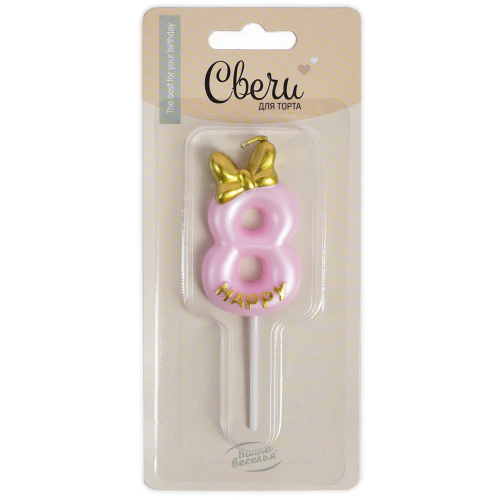 Свеча Цифра, 8 Золотой бант, на шпажке, Розовый, Металлик, 3,4*5,7 + 4 см, 1 шт. с держат., 802828