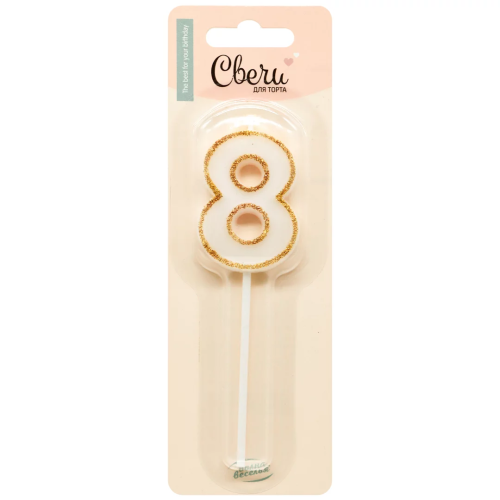 Свеча Цифра, 8 Золотой кант, на шпажке, Белый, с блестками, 4,5*5 + 7 см, 1 шт. с держат., 803088