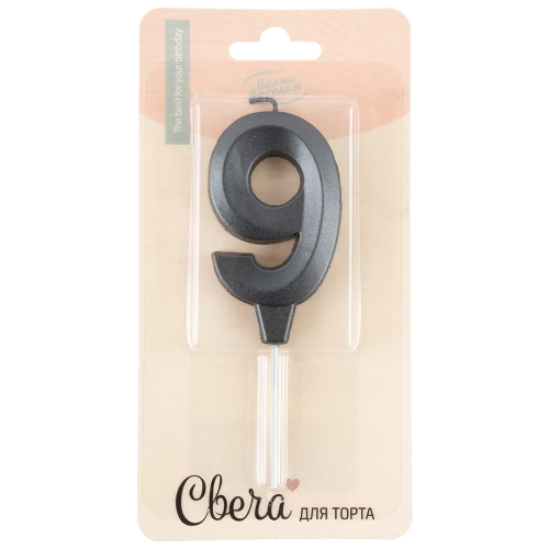 Свеча Цифра, 9 Грани, на шпажке, Мокрый асфальт, Металлик, 3,5*6,5 + 3,5 см, 1 шт. с держат., 3029