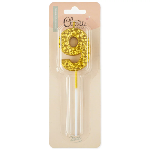 Свеча Цифра, 9 Кристалл, Золото, Металлик, 3,5*4,5 + 7 см, 1 шт. с держат., 802999