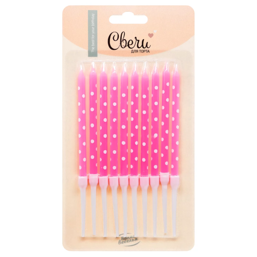 Свечи Белый горошек, Розовый, 0,6*8 + 4 см, 10 шт. с держат., 803030