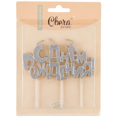 Свечи Буквы С Днем Рождения, Серебро, Металлик, с блестками, 9,5*4,5 + 4 см, 1 шт. с держат., 5234