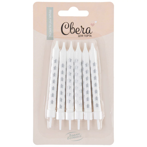 Свечи Серебряные звезды, Белый, Металлик, 7,5 + 2 см, 6 шт. с держат., 127166