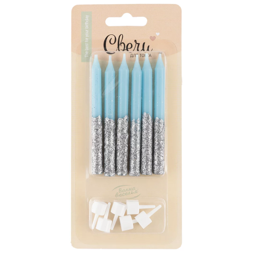 Свечи Сверкающий глиттер, Голубой/Серебро, с блестками, 0,77*8 см, 6 шт. с держат., 802735