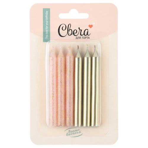 Свечи Золото/Розовый, Металлик, с блестками, 0,8*8 см, 6 шт., 620186GP