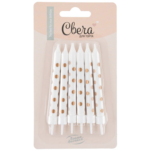 Свечи Золотые точки, Белый, Металлик, 7,5 + 2 см, 6 шт. с держат., 132416