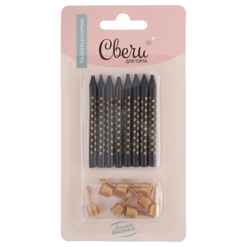 Свечи Золотые точки, Черный, Металлик, 0,5*6 + 1 см, 8 шт. с держат., 627052